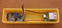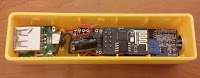 After spending too much time evaluating small enclosures for sale on E-Bay, I settled on a small usb charger case, which one can get for less than $1. The inside of the case had a female micro-usb mounted to a small pcb, which we will reuse.
